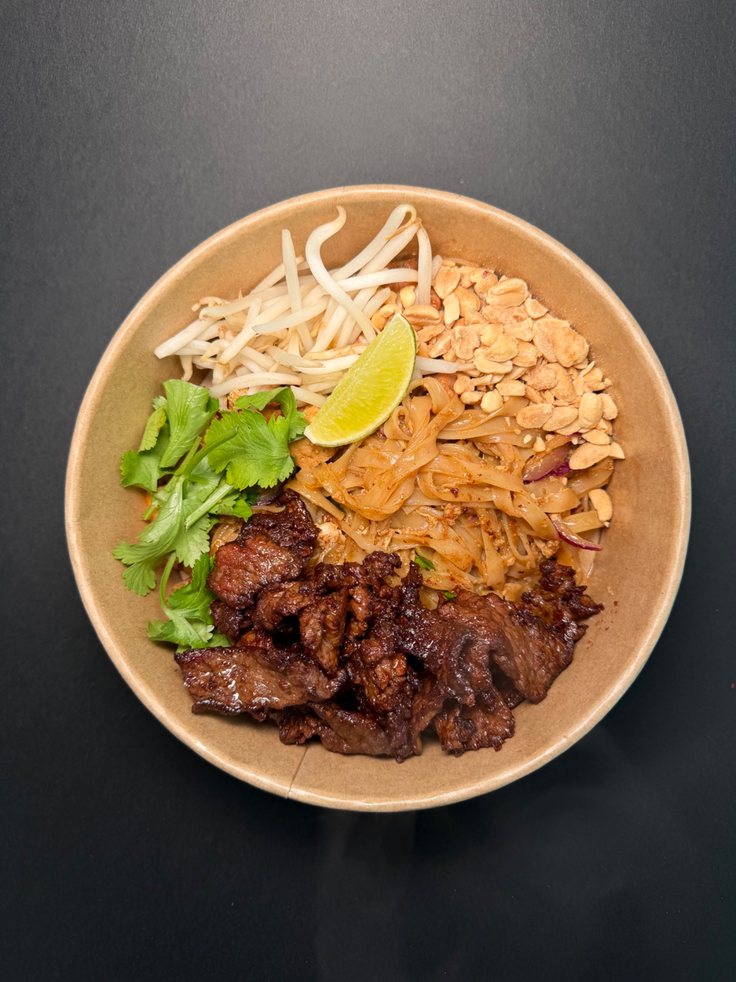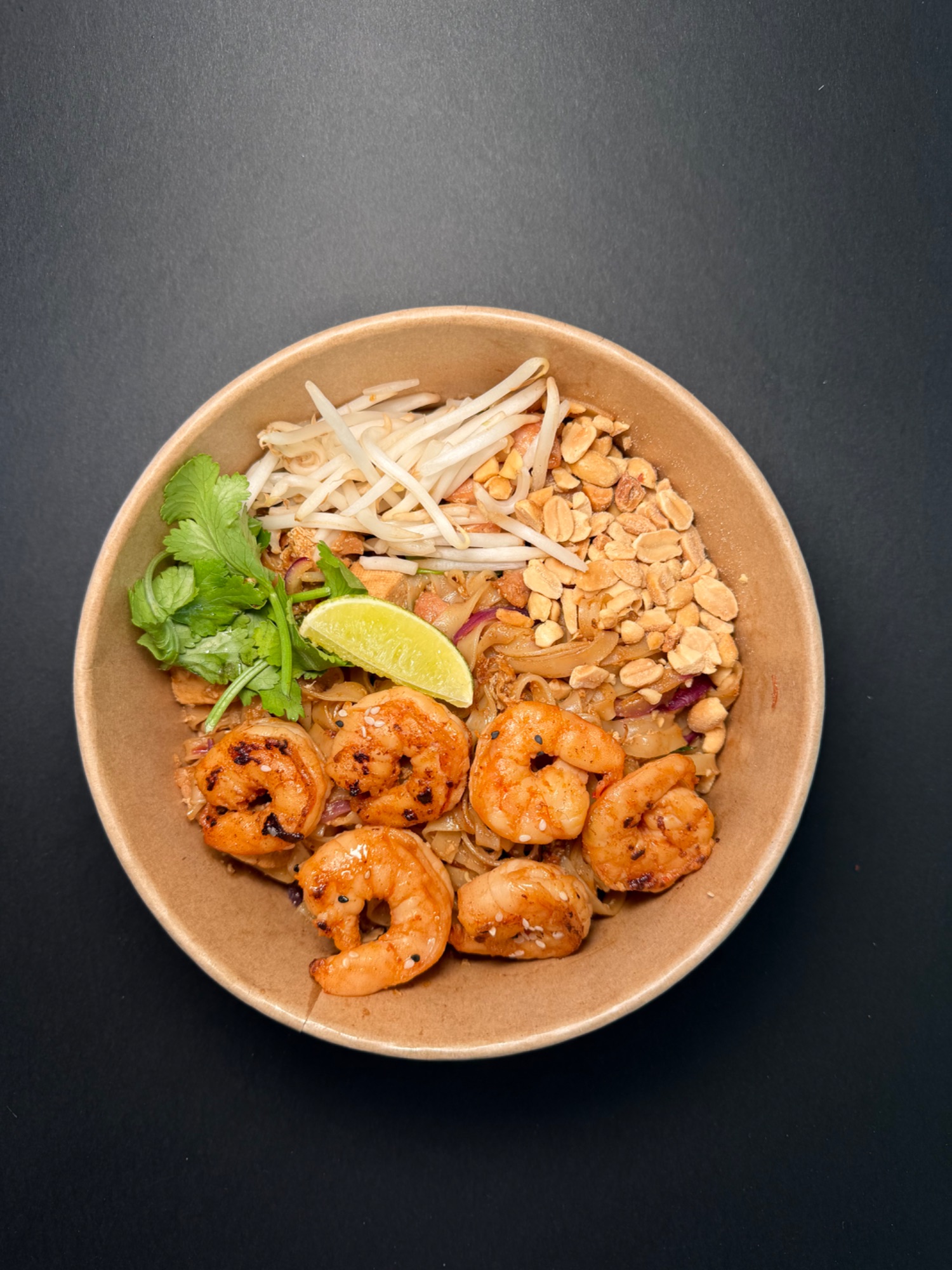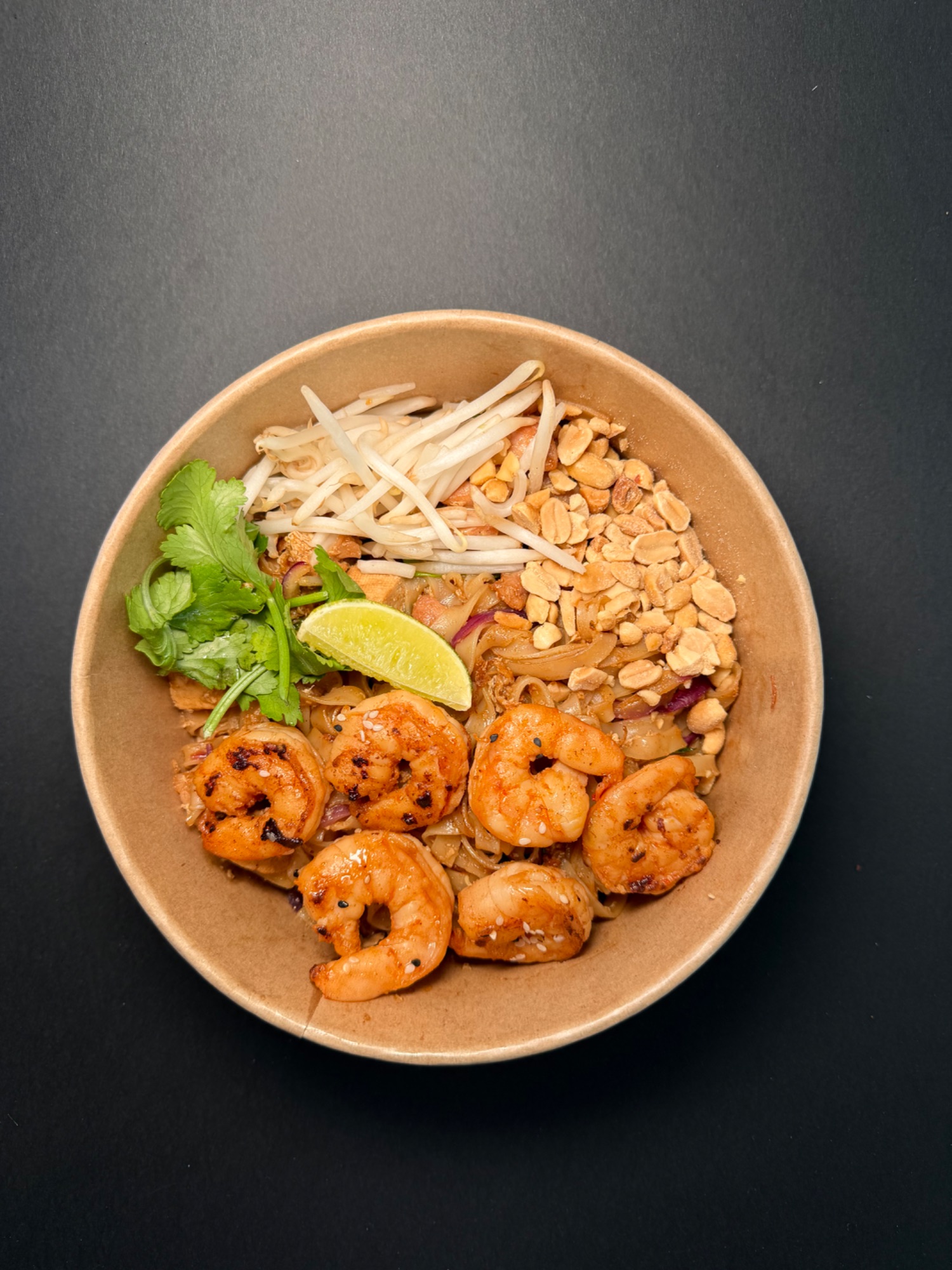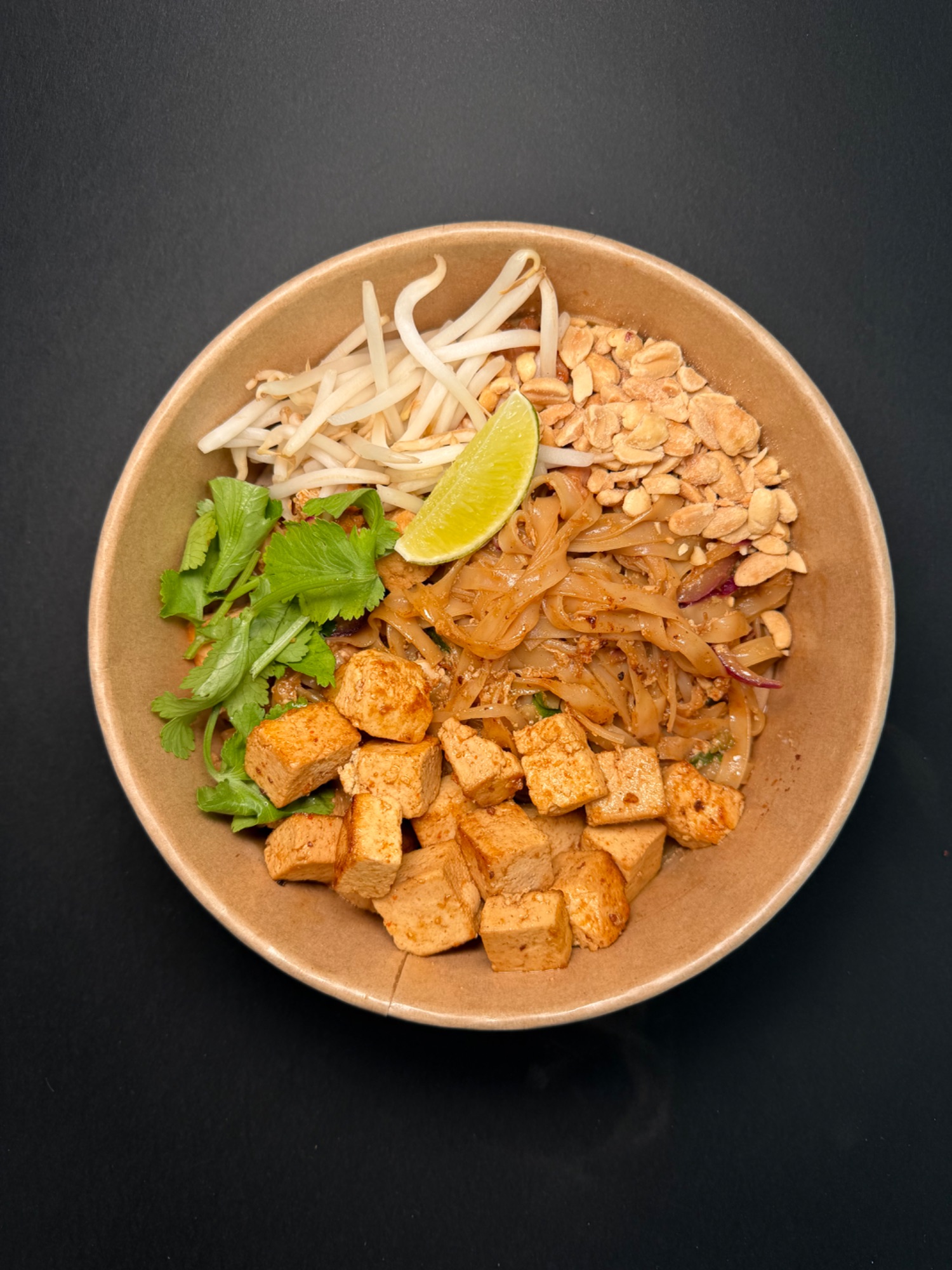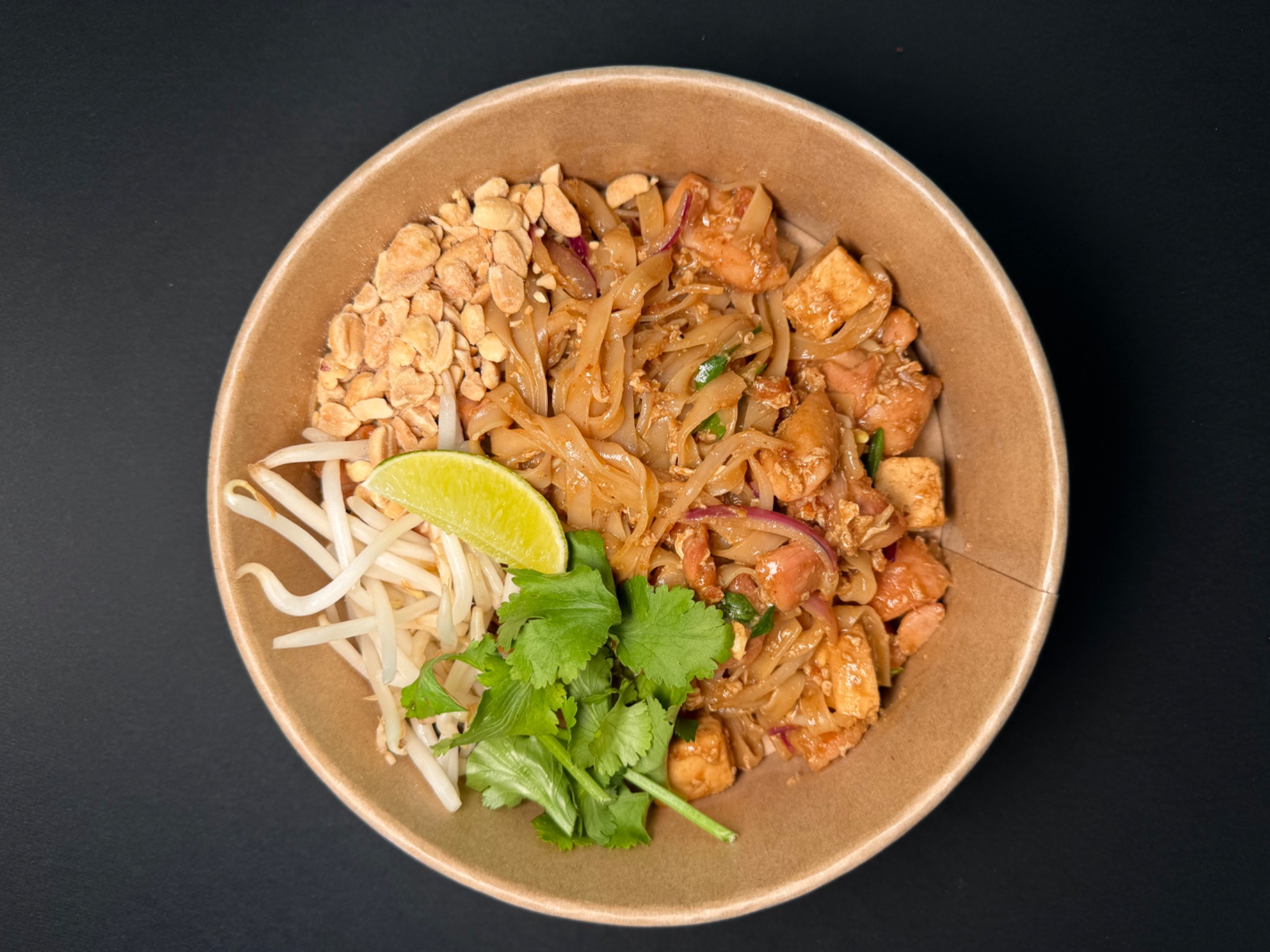 Pad Thai - Król tajskiego street foodu. Smażony na woku makaron ryżowy w naszym autorskim sosie z tamaryndowca, z jajkiem, kiełkami mung, czerwoną cebulą, tofu, szczypiorkiem. Serwowany z prażonymi orzechami ziemnymi, cząstką limonki, kolendrą oraz płatkami chili.
