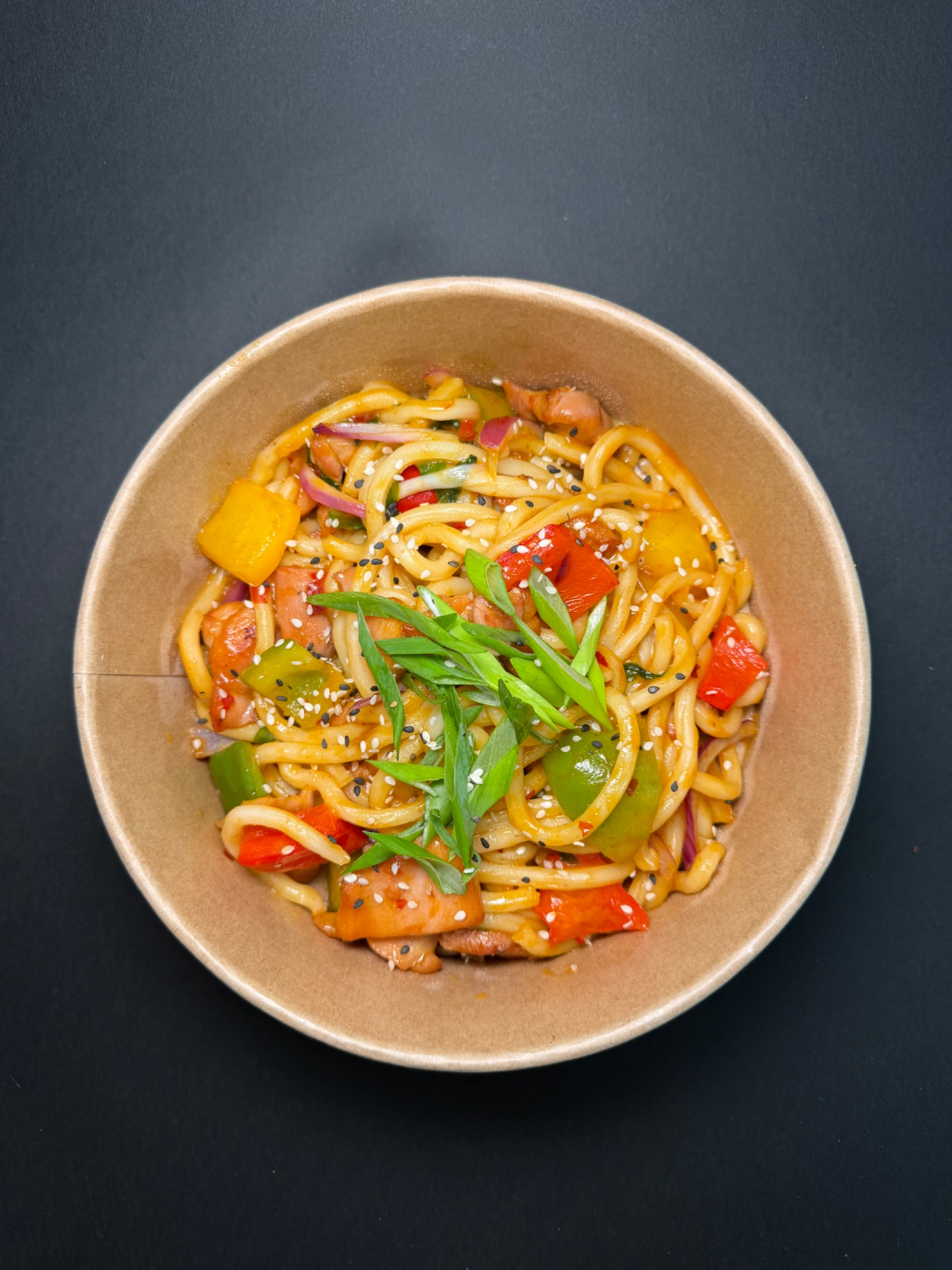 Mango chili udon - Pszenny makaron udon smażony z papryką, porem i czerwoną cebulą w lekko pikantnym sosie mango - chili i posypane szczypiorkiem.